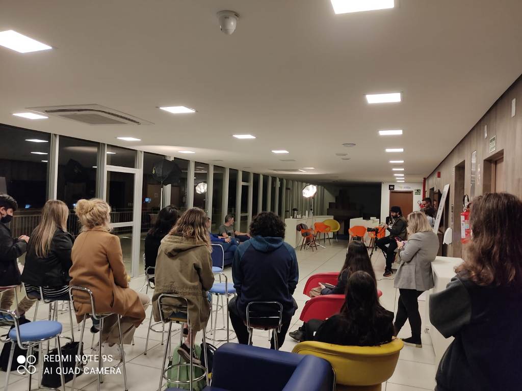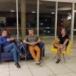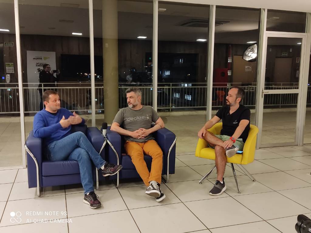 Ao lado de Silva estavam outros dois empreendedores do CIB. Rafael Lessa, CEO da startup ítalo-brasileira X-Lam Engineering do Brasil e Alessandro Mendes, CEO da startup Idealizei. Estas duas startups têm sede no CIB e atualmente participam do Programa de Incubação, encabeçado pelo Instituto Gene – entidade gestora do CIB -, em parceria com a Fapesc e Sedec (Prefeitura de Blumenau). Durante quase uma hora de conversa, eles comentaram e debateram questões sobre a temática de inovação no mercado empresarial e profissional nos dias de hoje.