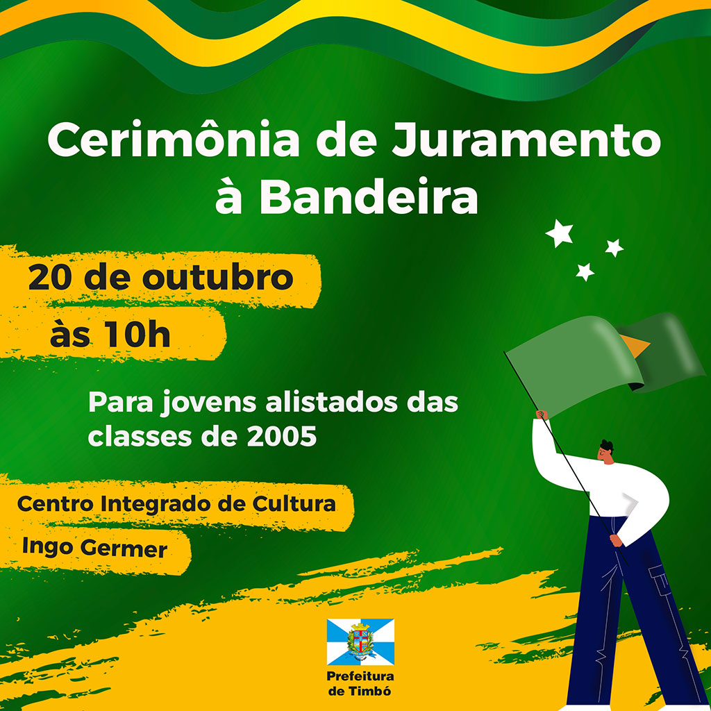 No dia 20 de outubro será realizada a Cerimônia de Juramento à Bandeira Nacional, pela Junta de Serviço Militar de Timbó.