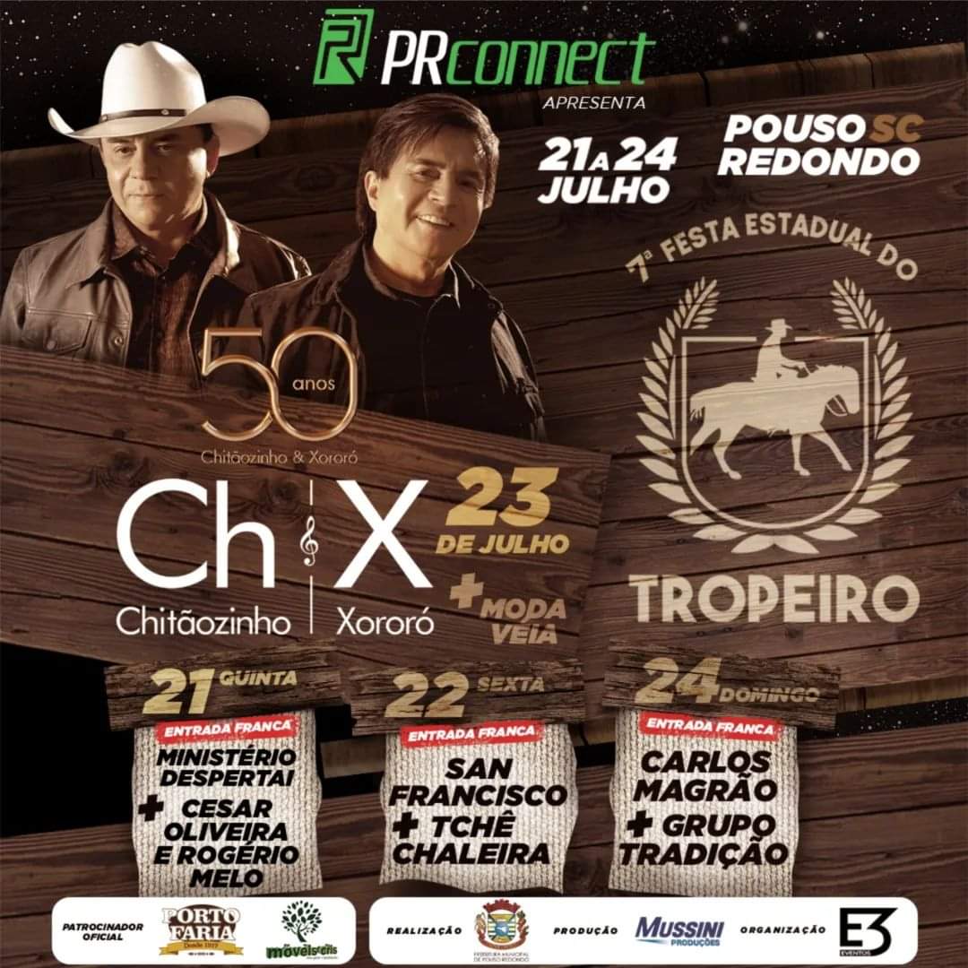 A 7ª Festa Estadual do Tropeiro será realizada entre os dias 21 a 24 de julho, no Centro de Eventos Herança Tropeira. Dentro da programação artística o destaque é o show nacional com Chitãozinho e Xororó.