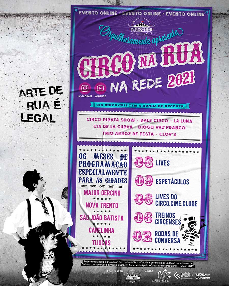 Palhaçaria, acessibilidade, encontros virtuais e reverência ao circo. De maio a outubro de 2021, a Cia Circo-íris traz a Santa Catarina a 3ª edição do Circo na Rua, na Rede, desta vez em formato on-line devido a pandemia de convid-19. O projeto contará com apresentações de espetáculos circenses, rodas de conversa, treinos de circo, lives e CircoCineClube que acontecerão pelas redes sociais da Cia Circo-Íris. Todas as ações são gratuitas e abertas à comunidade, com interpretação em Libras, classificação indicativa Livre, e chapéu virtual para contribuição espontânea e consciente.
