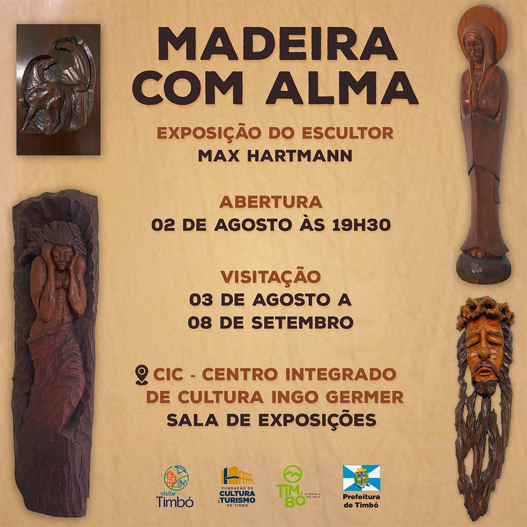 No dia 02 de agosto acontece a abertura da exposição ‘Madeira com Alma’, com obras do escultor alemão Max Hartmann. Será às 19h30, na Sala de Exposições do CIC – Centro Integrado de Cultura Ingo Germer.