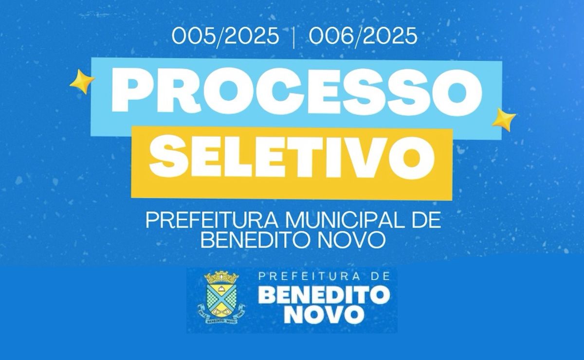 A Prefeitura de Benedito Novo divulgou a classificação final dos Processos Seletivos nº 005/2025, destinado a estágio, e nº 006/2025, voltado à contratação temporária. Os resultados já estão disponíveis para consulta pública.
