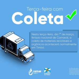 O SAMAE Timbó informa que nesta terça-feira, dia 1º de março, feriado nacional de Carnaval, a coleta de materiais recicláveis e resíduos orgânicos será realizada normalmente em Timbó.