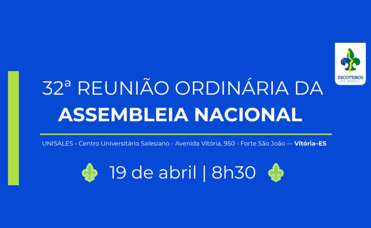 Vitória – Espírito Santo – ES | 19 abril 2026. O Conselho de Administração Nacional da União dos Escoteiros do Brasil (UEB), publicou na data (13/02) o edital de convocação para a 32ª Reunião Ordinária da Assembleia Nacional Escoteira que será realizada durante o 31º Congresso Nacional Escoteiro, na UNISALES – Centro Universitário Salesiano – Avenida Vitória, 950 – Forte São João — Vitória–ES, no dia 19 de abril de 2026 (domingo), às 08h30 (horário oficial de Brasília).