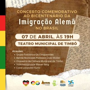 Neste domingo, dia 07 de abril, o Teatro Municipal de Timbó será palco do Concerto do Bicentenário da Imigração Alemã no Brasil. O evento inicia às 19h, é gratuito e aberto a toda comunidade.