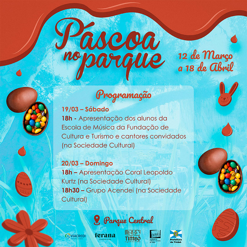A programação de atrações culturais da Páscoa no Parque de Timbó continua neste final de semana, na Sociedade Cultural. No sábado, dia 19, a partir das 18h, acontece a apresentação dos alunos da Escola de Música da Fundação de Cultura e Turismo e cantores convidados. Já no domingo, dia 20, o Coral Leopoldo Kurtz inicia as apresentações, às 18h, seguido pelo Grupo Acendei, às 18h30.