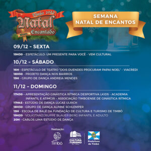 No domingo, dia 11 de dezembro, as apresentações iniciam a partir das 17h30, no Teatro Municipal, com Apresentação Ginástica Rítmica Desportiva Lkids – Academia Infantil e ATIMGIR – Associação Timboense de Ginástica Rítmica, Estúdio de Dança Lucas Ulrich, Grupo de Dança Alinne Schlemper, Escola de Balé da Fundação de Cultura e Turismo de Timbó, Volkstanzgruppe Blauer Berg Infantil e Adulto e Carlos Lima Estúdio de Dança. Acesse aqui a programação completa: https://www.timbo.sc.gov.br/destaque/2022/confira-a-programacao-deste-final-de-semana-do-natal-mais-encantado-de-timbo/