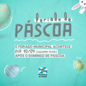 Nesta sexta-feira, dia 07 de abril, celebra-se a Sexta-feira Santa, feriado nacional. E na segunda-feira, dia 10 de abril, é feriado municipal em Timbó. A Lei nº 754, de 1980, transfere para a segunda-feira após a Páscoa o feriado municipal do dia 12 de outubro, aniversário de fundação do município.
