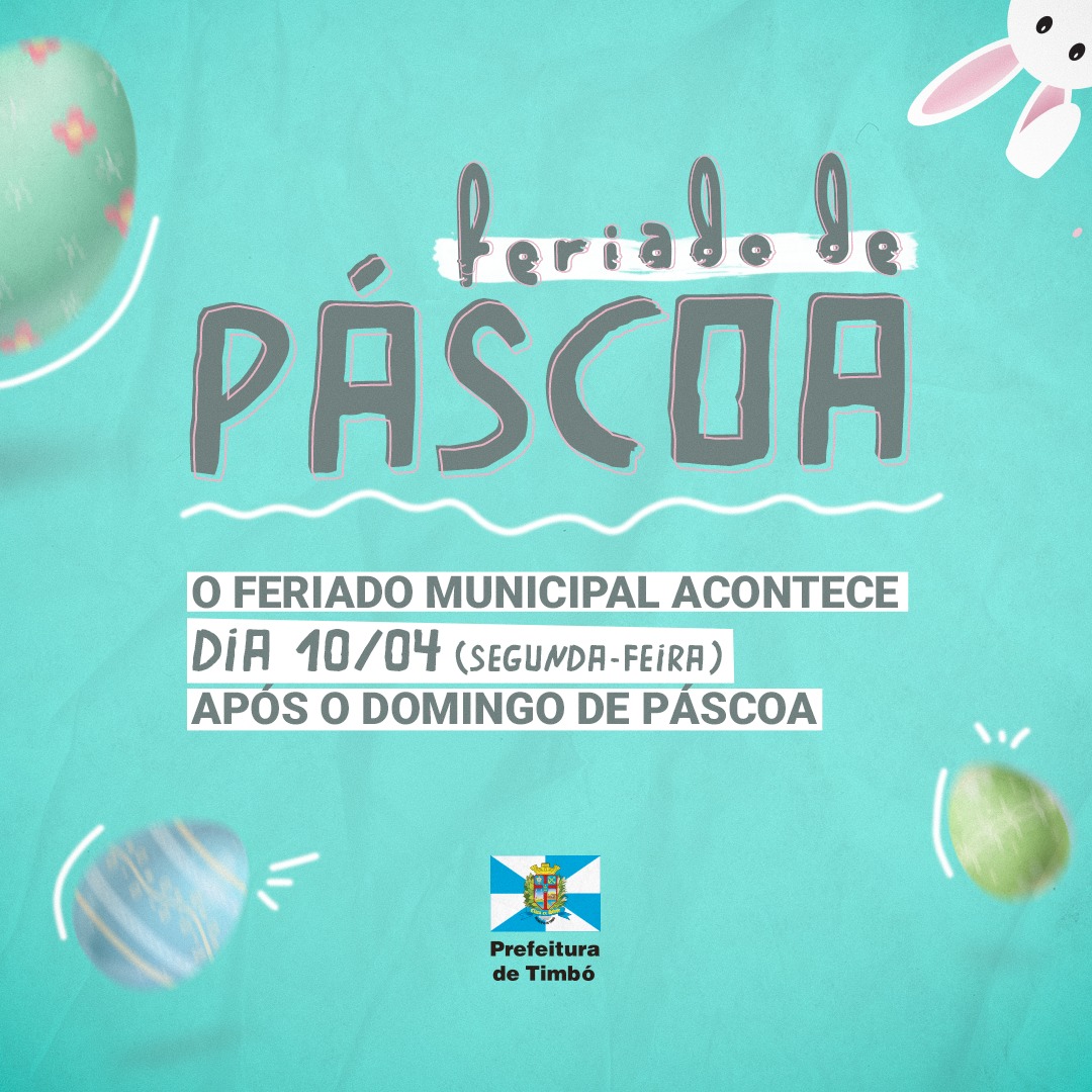 Nesta sexta-feira, dia 07 de abril, celebra-se a Sexta-feira Santa, feriado nacional. E na segunda-feira, dia 10 de abril, é feriado municipal em Timbó. A Lei nº 754, de 1980, transfere para a segunda-feira após a Páscoa o feriado municipal do dia 12 de outubro, aniversário de fundação do município.
