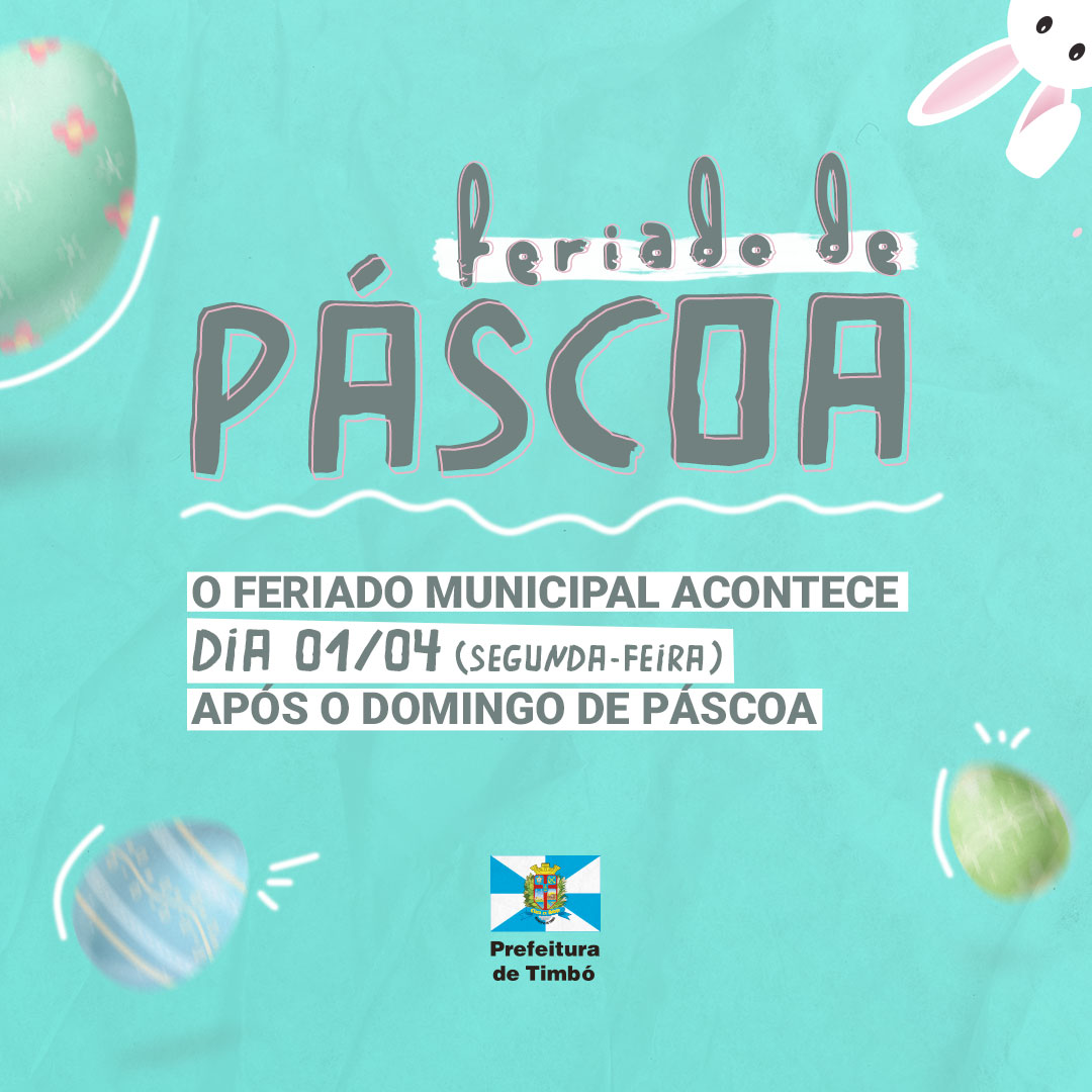 Nesta sexta-feira, 29 de março, celebra-se a Sexta-feira Santa, feriado nacional. E na segunda-feira, dia 01 de abril, é feriado municipal em Timbó. A Lei nº 754, de 1980, transfere para a segunda-feira após a Páscoa o feriado municipal do dia 12 de outubro, aniversário de fundação do município.