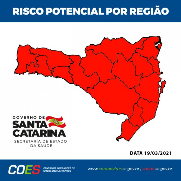 A Secretaria de Estado da Saúde divulgou neste sábado, 20, os dados da Matriz de Risco Potencial em relação ao novo coronavírus. O mapa aponta que todas as regiões catarinenses permanecem em nível gravíssimo (cor vermelha) pela quarta semana seguida.