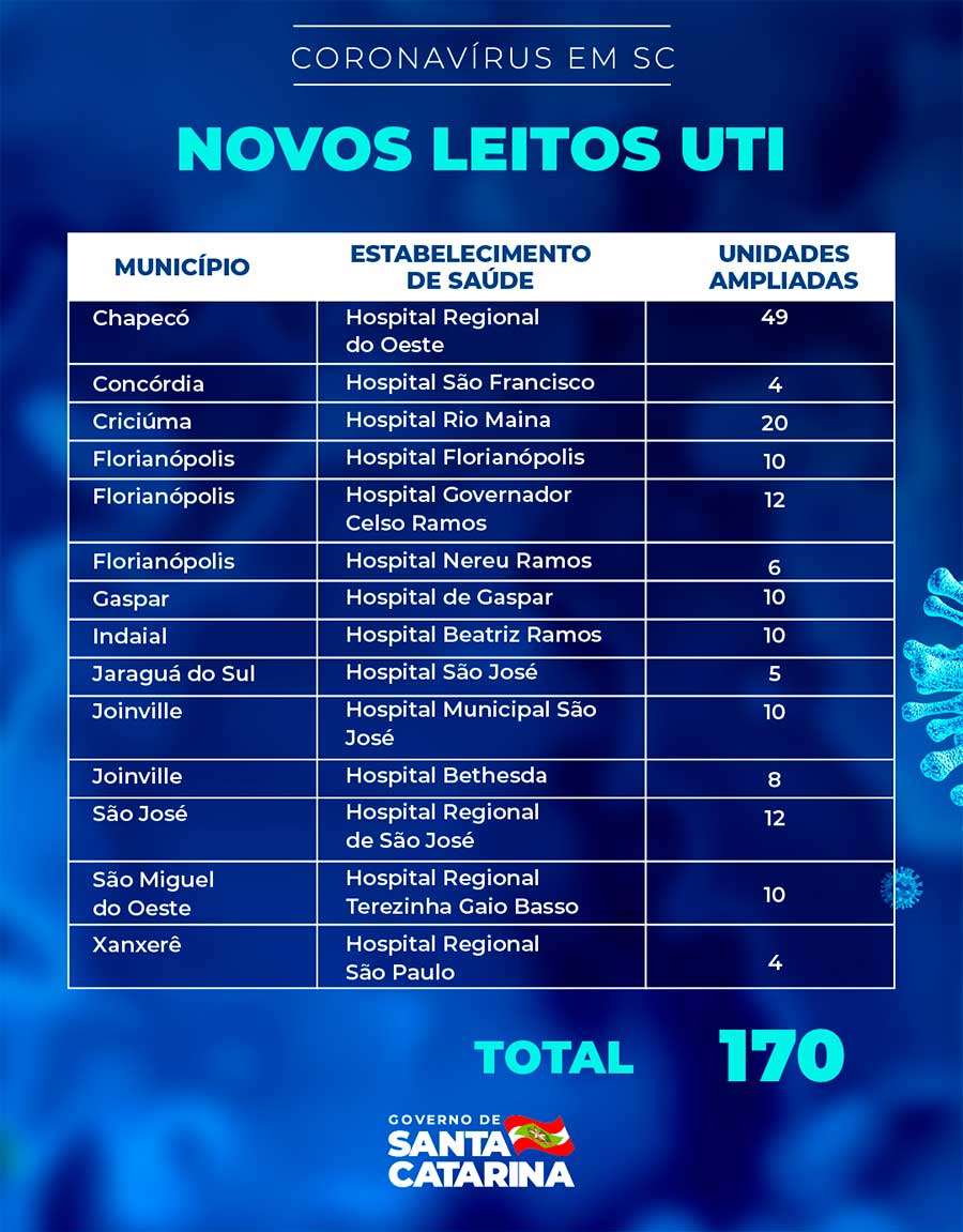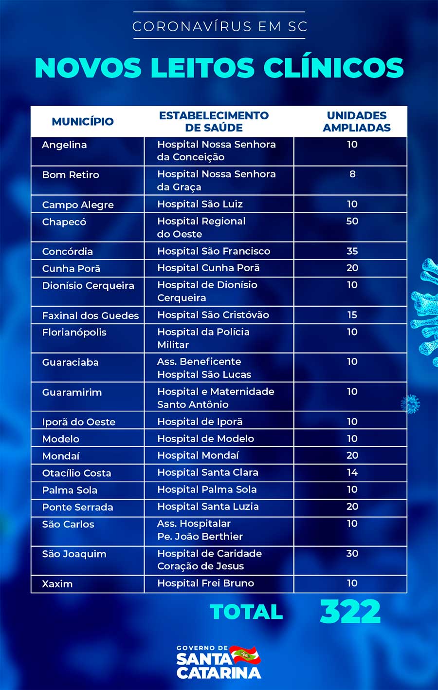 O Governo do Estado, por meio da Secretaria da Saúde (SES), pactuou a abertura de 322 novos leitos clínicos e 170 novos leitos de UTI em todas as regiões de Santa Catarina. As unidades foram ampliadas ou estão em processo de ampliação nos últimos 30 dias, em um esforço adicional das equipes estaduais em aumentar a rede de atendimento aos pacientes de Covid-19. Desde o início da pandemia, o número de leitos públicos de terapia intensiva foi ampliado em mais de 160%, ultrapassando os 1,5 mil leitos de UTI.