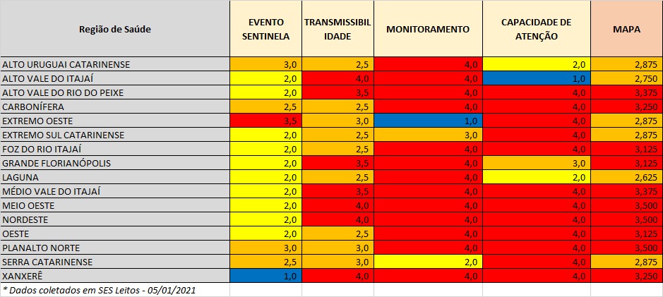 A Matriz de Risco Potencial divulgada nesta quinta-feira, 07, pelo Governo de Santa Catarina e Secretaria de Estado da Saúde (SES) classifica 10 das 16 regiões de saúde catarinenses como em alerta gravíssimo (cor vermelha) para transmissão do novo coronavírus. No boletim anterior, eram 12 locais neste patamar. As outras seis regiões estão em estado grave (cor laranja).