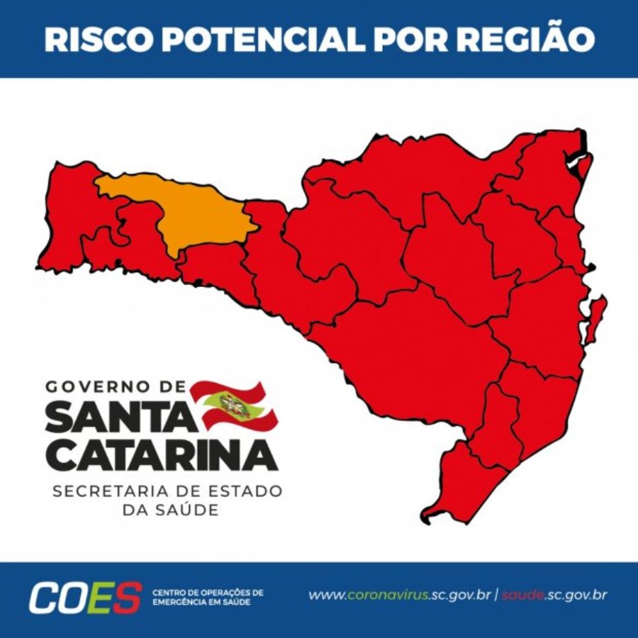 A Matriz de Risco Potencial para a Covid-19 divulgada nesta sexta-feira, 18, pelo Governo de Santa Catarina e Secretaria de Estado da Saúde (SES) classifica 15 das 16 regiões de saúde em alerta gravíssimo. Somente a região de Xanxerê se encontra em nível grave.