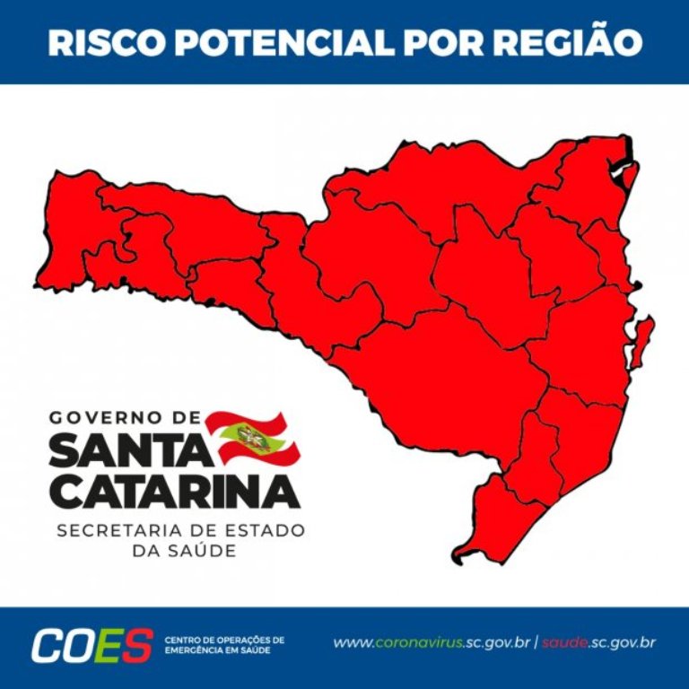 A Matriz de Risco Potencial divulgada nesta quarta-feira, 23, pelo Governo de Santa Catarina e Secretaria de Estado da Saúde (SES) classifica todas as 16 regiões de saúde do estado em alerta gravíssimo (cor vermelha) para a Covid-19.