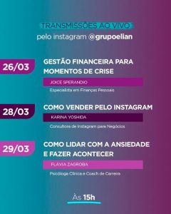 “Além das dicas de saúde e prevenção contra o Coronavírus, a programação que preparamos irá abordar outros assuntos que são essenciais para a visão de negócios como, por exemplo, a gestão de equipes à distância, como vender em momento de crise e o cuidado na saúde financeira das empresas. Esse conteúdo é pensado, em especial, para os empreendedores e varejistas que, mais do que nunca, precisam tomar as melhores decisões para garantir a saúde dos seus negócios. Nesse momento precisamos nos unir e compartilhar informação de qualidade e estratégias que vão garantir a retomada dos próximos meses. Conhecimento é sempre a melhor estratégia para garantir resultado”, afirma a coordenadora de Marketing do Grupo Elian, Camila Felício.