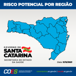 Pela primeira vez desde que foi implementada em Santa Catarina em 29 de julho de 2020, a Matriz de Risco Potencial Regionalizado divulgada neste sábado, 11, aponta todas as 17 regiões como risco potencial moderado (cor azul). Além disso, pela décima semana consecutiva, nenhuma região do estado foi classificada nos níveis de risco Grave (laranja) ou Gravíssimo (vermelho). A última vez que a Matriz classificou uma região no nível Grave foi no dia 01 de outubro, e no nível Gravíssimo no dia 11 de setembro. Desde então houve avanço na vacinação que, alinhado a uma redução na taxa de hospitalização, na ocupação de leitos de UTI Adulto para tratamento da Covid-19 e na taxa de mortalidade, vem mantendo a tendência de redução da gravidade da pandemia em todas as regiões do Estado.