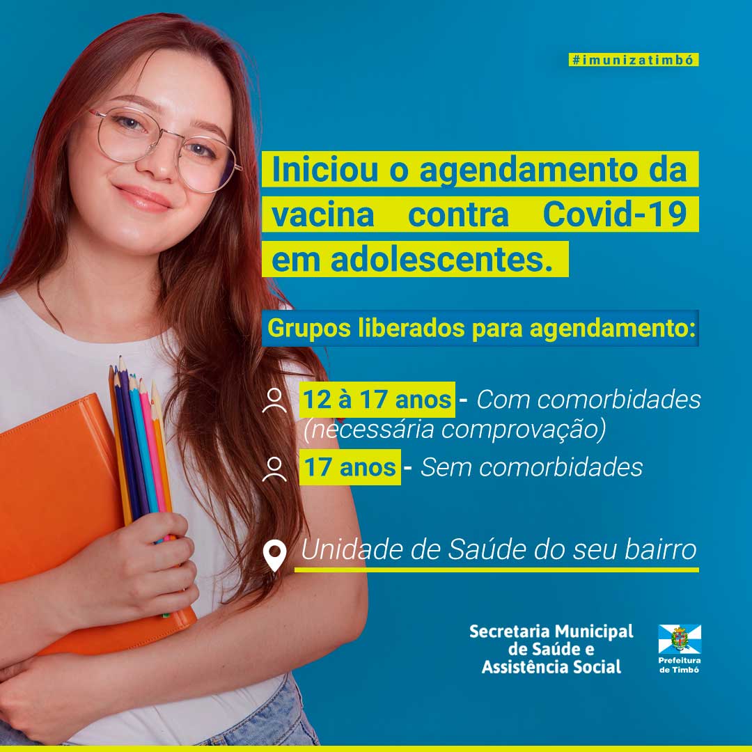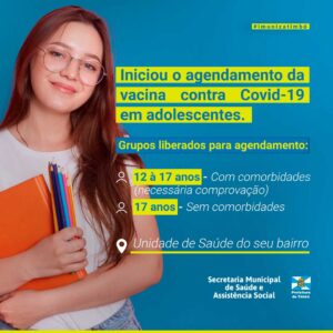 A Secretaria de Saúde informa que iniciou o agendamento da vacina contra Covid-19 em adolescentes. Os dois grupos que estão liberados para agendamento até o momento são adolescentes entre 12 e 17 anos com comorbidades (confira a lista abaixo) e adolescentes de 17 anos sem comorbidades.