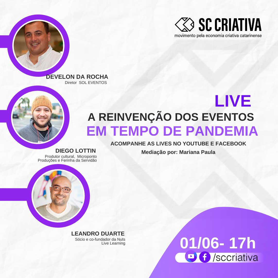 – Segunda-feira, 1º/6, às 17h: A reinvenção dos eventos em tempo de pandemia, no YouTube e Facebook do SC Criativa. Com Develon da Rocha (Sol Eventos, Blumenau), Diego Lottin (Microponto Produções, Blumenau) e Leandro Duarte (Agência Nuts, SP). Mediação de Mariana Paula (Trilha Filmes)