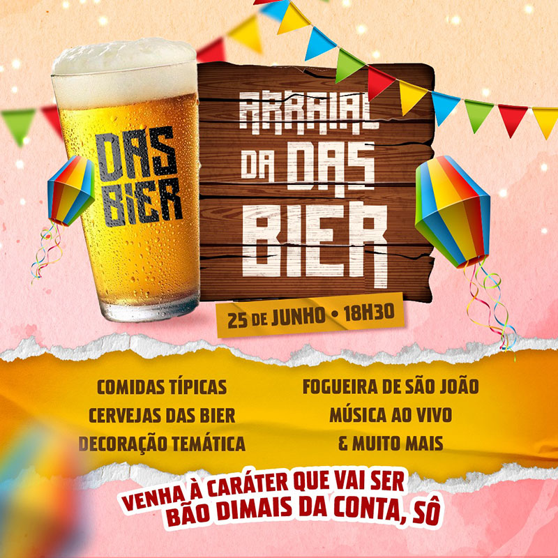 Todo o Parque Das Bier estará decorado com artigos juninos para a comemoração no sábado, dia 25. O local estará aberto para receber o público a partir das 8h da manhã e às 18h30mim inicia a Festa Junina, com um cardápio especial temático, mas com o diferencial das cervejas da casa. “Além do quentão, que não pode faltar, daremos o toque Das Bier, com a variedade de cervejas que combinam com esse clima mais friozinho e com as comidas típicas juninas”, destaca Larissa Schmitt, diretora do complexo Das Bier.