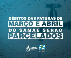 Em relação aos débitos: todos os consumidores do SAMAE que porventura não conseguiram efetuar o pagamento de suas faturas que venceram respectivamente nos meses de março e abril, terão esses débitos automaticamente parcelados, em 12 parcelas, sendo que a primeira parcela será lançada na fatura que será emitida agora no mês de maio e com vencimento para junho.