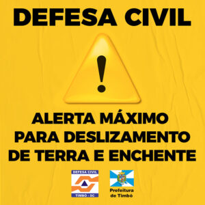 Após reunião com membros da Defesa Civil do Estado, a Defesa Civil de Timbó emitiu novo alerta máximo para mais chuvas e deslizamentos de terra. De acordo com previsão feita pela Defesa Civil estadual, pode chover entre 80 e 150mm em Timbó, entre o início da noite desta terça-feira e amanhã.