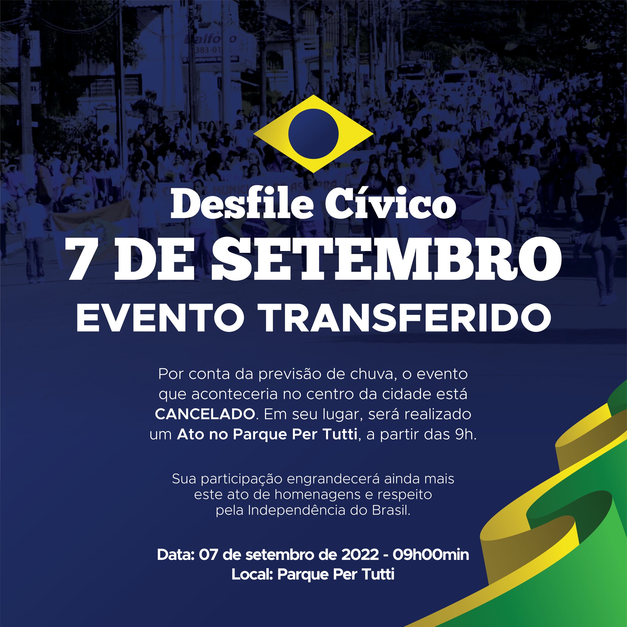 A Prefeitura de Ascurra, através da Secretaria de Educação e Diretoria de Cultura, informa que o Desfile Cívico em alusão à Independência do Brasil, no dia 07 de setembro, não acontecerá mais no centro da cidade. O evento será realizado no Parque Per Tutti, a partir das 9 horas. A mudança é necessária por conta da previsão de chuva para amanhã.