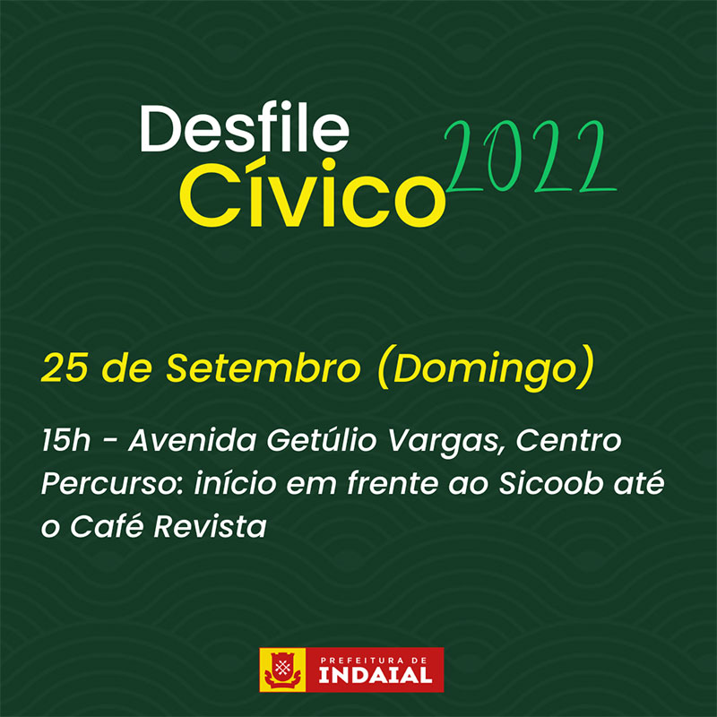 No dia 25 de setembro (domingo), a partir das 15h, a Prefeitura de Indaial irá promover o Desfile Cívico em comemoração à Independência do Brasil. O evento foi transferido para essa data tendo em vista que no dia 7 choveu, inviabilizando a realização do Desfile.
