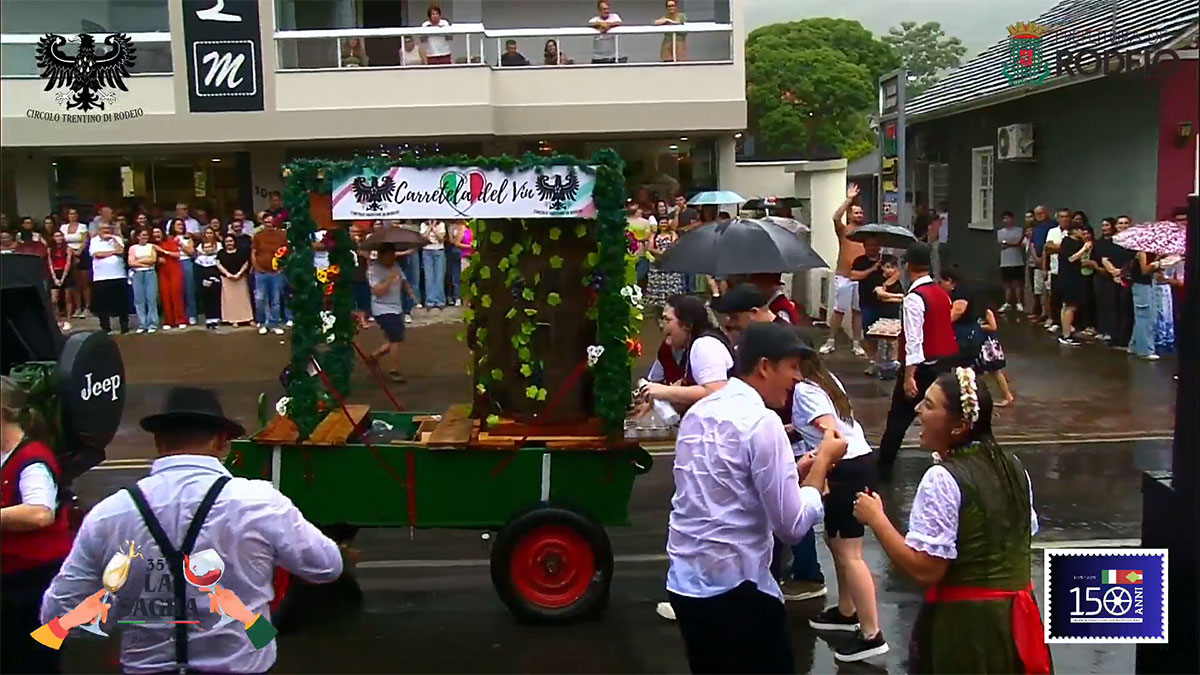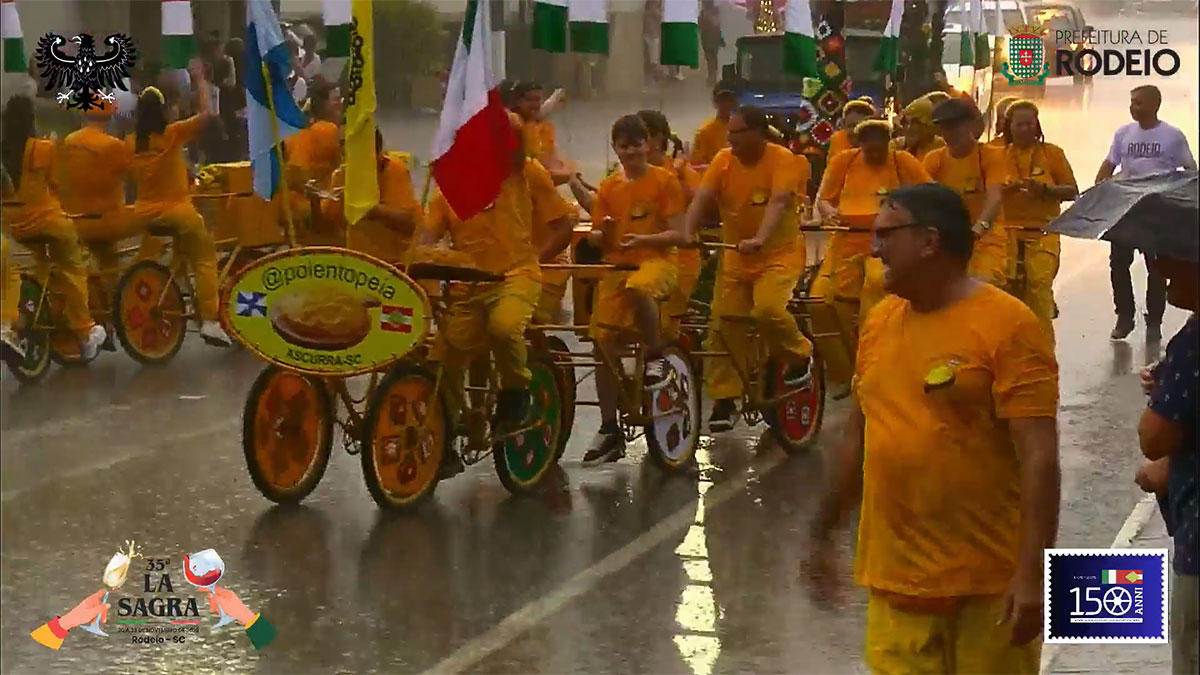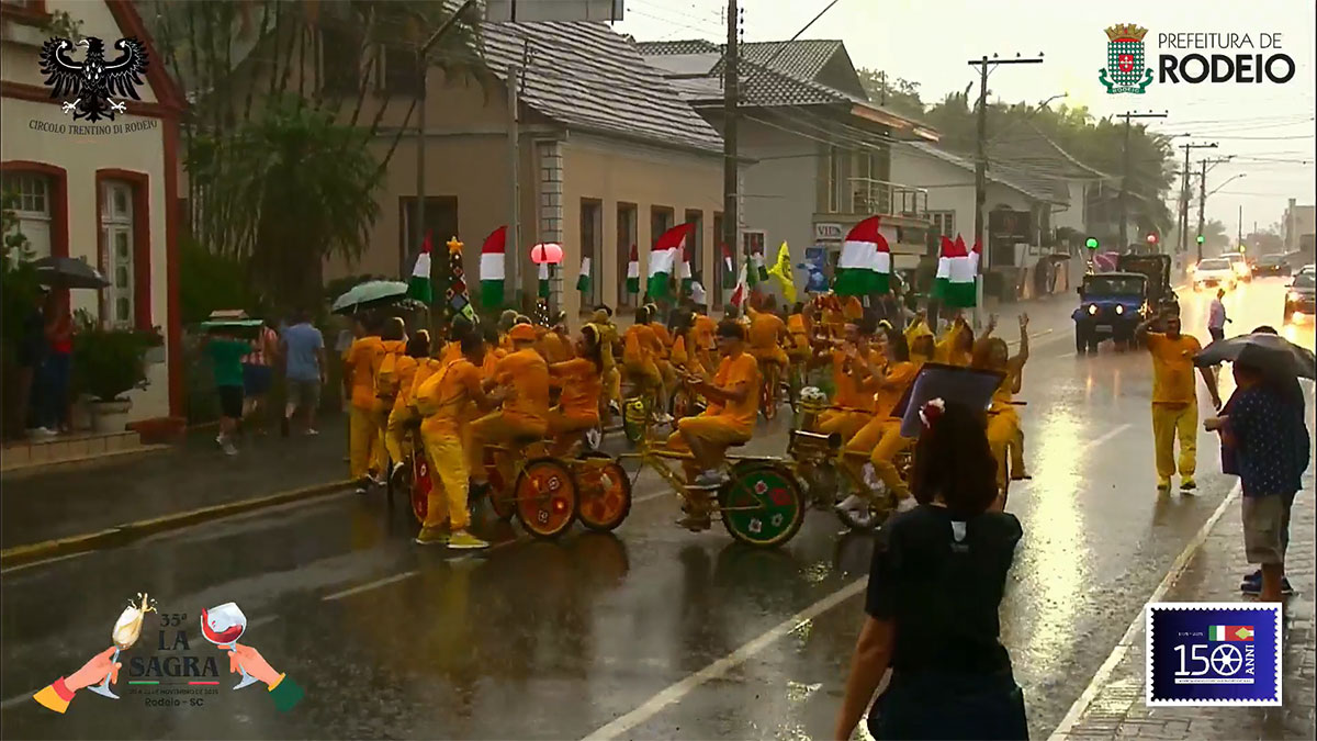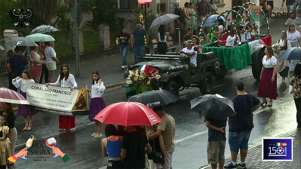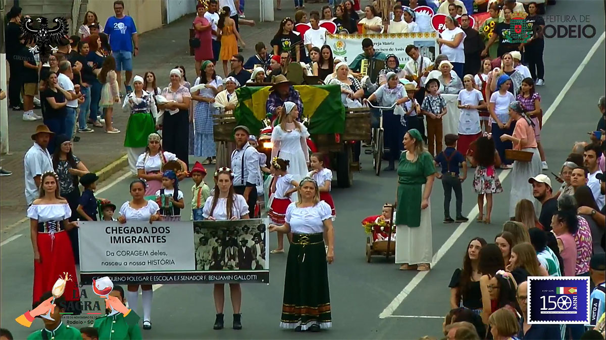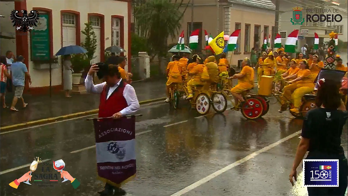 O desfile comemorativo aos 150 anos da Imigração Italiana em Rodeio foi um sucesso na tarde deste sábado, mesmo com a chuva que caiu sobre o município. O público compareceu em peso, acompanhou todo o percurso e vibrou com as atrações que seguiram da frente da Prefeitura Municipal até a Vila Italiana.