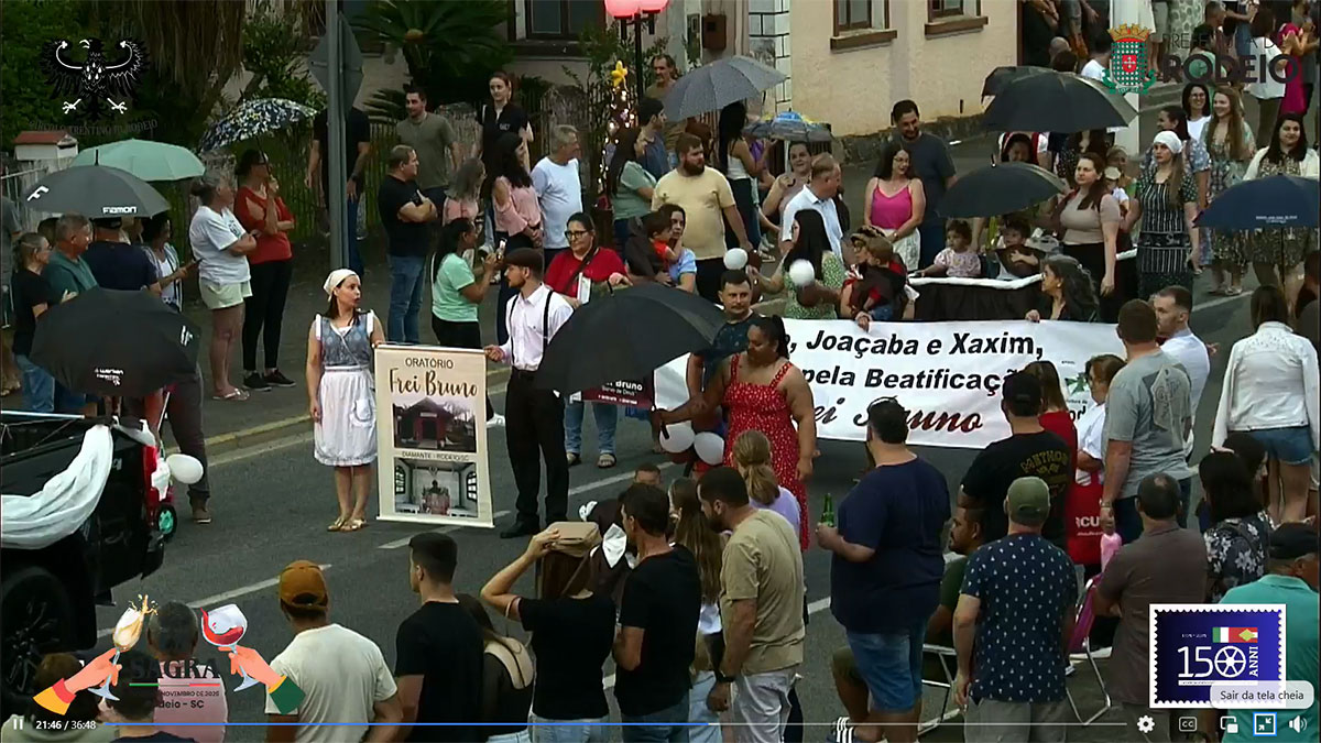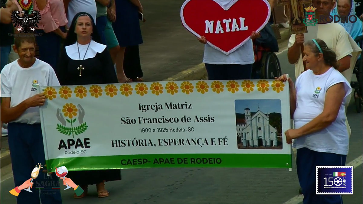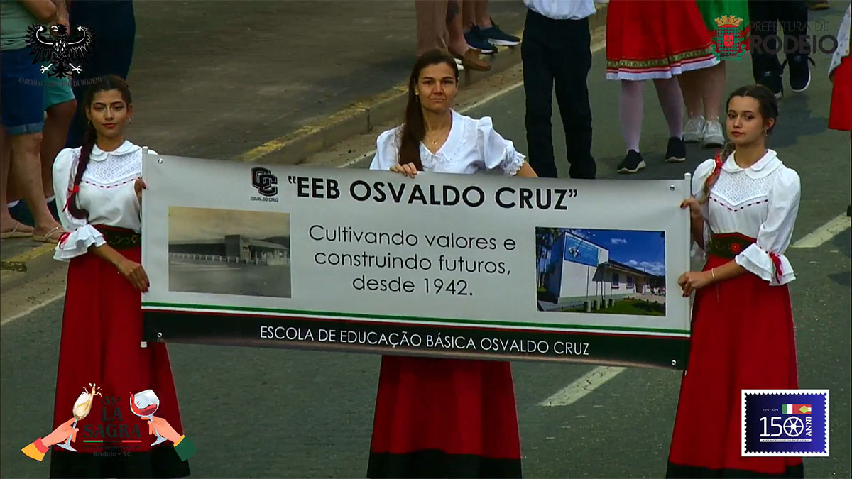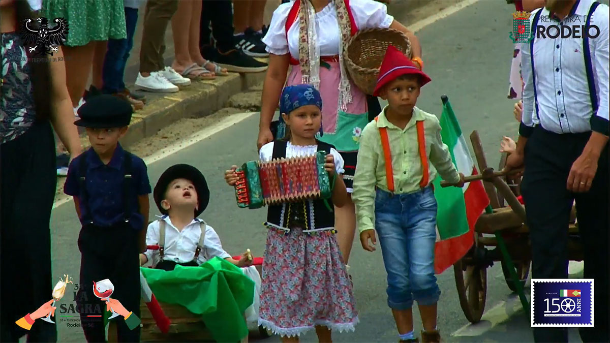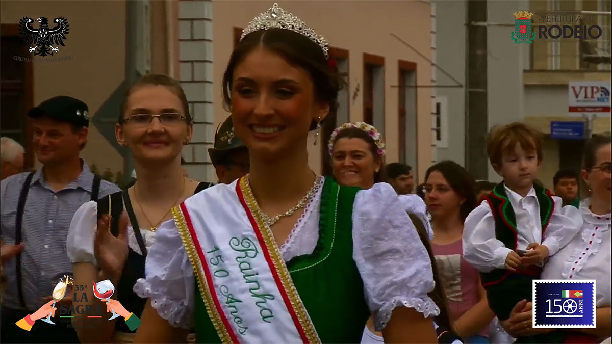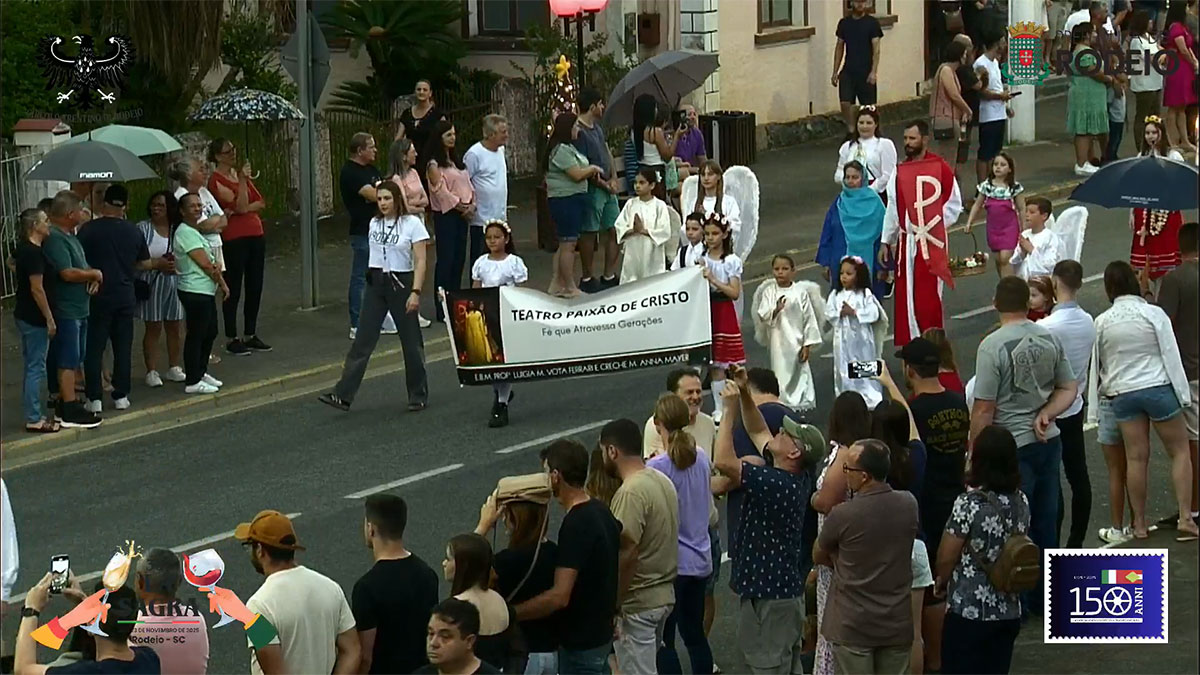 O desfile comemorativo aos 150 anos da Imigração Italiana em Rodeio foi um sucesso na tarde deste sábado, mesmo com a chuva que caiu sobre o município. O público compareceu em peso, acompanhou todo o percurso e vibrou com as atrações que seguiram da frente da Prefeitura Municipal até a Vila Italiana.