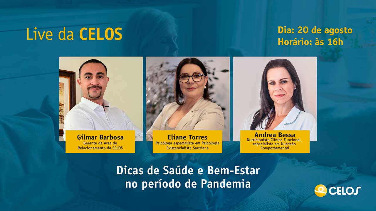 O interlocutor desse bate-papo será o gerente da área de relacionamento da Fundação, Gilmar Barbosa, que conversará com a psicóloga Eliane Regina Ternes Torres, especialista em psicologia existencialista sartriana, e a nutricionista clínica funcional Andrea Livramento Bessa, especialista em nutrição comportamental. Ambas são profissionais credenciadas aos Planos de Saúde da CELOS.