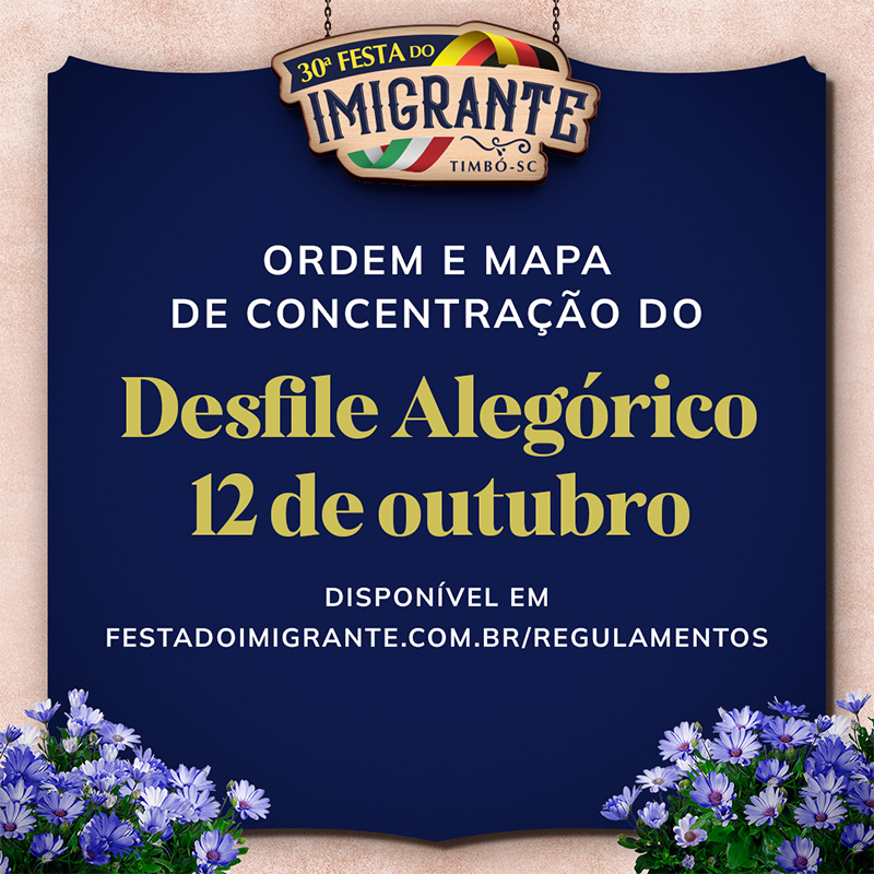 Todos os grupos que participarão do Desfile Alegórico de 12 de outubro deverão se posicionar conforme mapa de concentração que está disponível aqui. Acesse aqui também acesse lista da ordem do desfile e o regulamento. “Brindes, mesmo que sejam balas, durante o desfile, só podem entregues em mãos ao público”, destacou em reunião o presidente da CCO da 30ª Festa do Imigrante, Jorge Ferreira.