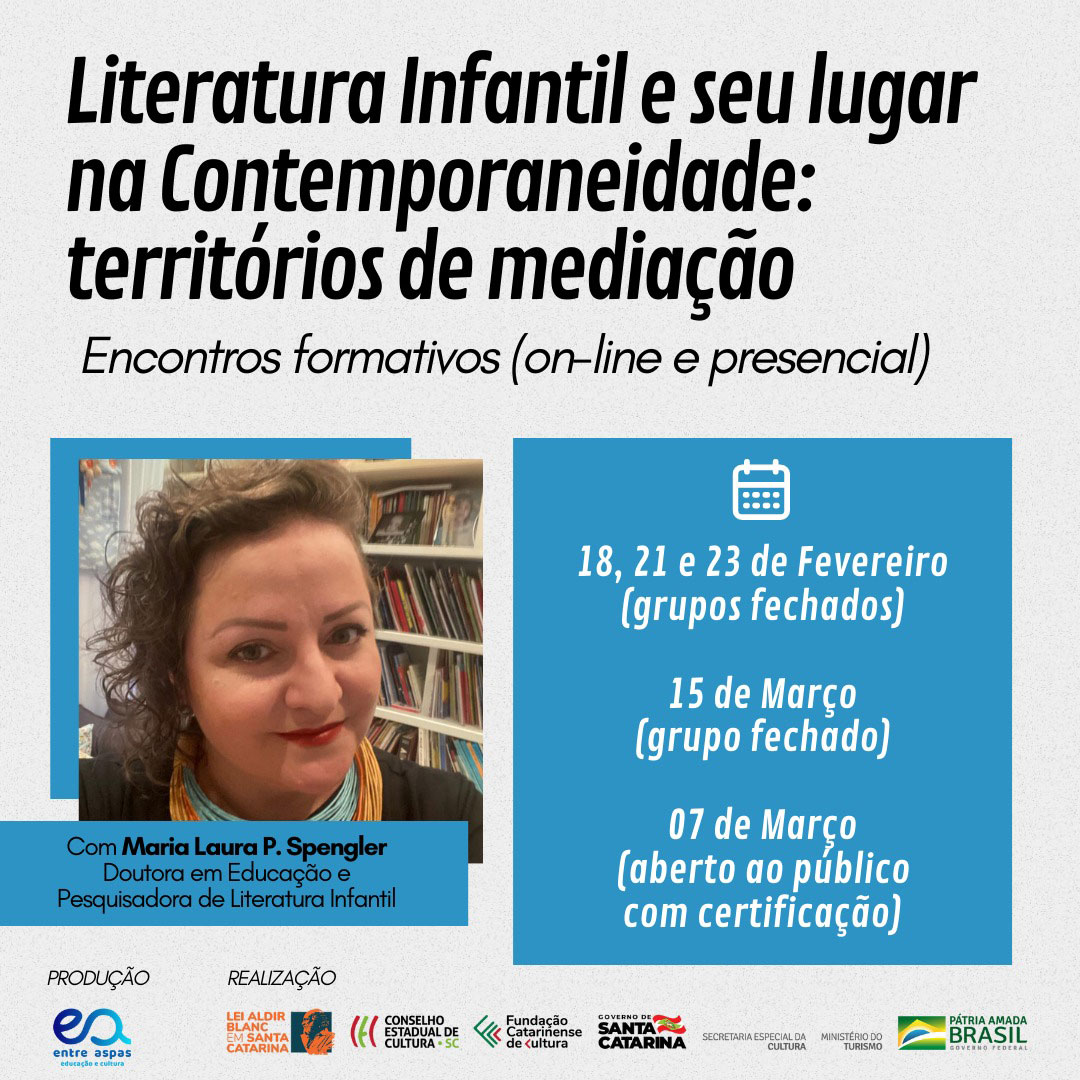 Educação e Cultura. De 18 de fevereiro a 16 de março, a Doutora em Educação e pedagoga Maria Laura P. Spengler traz ao Vale do Itajaí o projeto Literatura Infantil e Seu Lugar na Contemporaneidade: Territórios de mediação; com encontros formativos sobre literatura infantil, em formato online e presencial. As ações do projeto serão gratuitas e voltadas para professores e gestores de instituições educativas públicas e privadas, bibliotecários, agentes culturais, público geral interessado e contarão com tradução em LIBRAS.