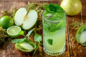 Amasse bem as folhas de hortelã e passe no copo. Ele deve ficar bem perfumado. Adicione todos os outros ingredientes, exceto os cubos de gelo, e misture. Por fim, complete com o gelo e decore com folhas de hortelã.