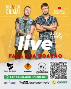 Maio 6, 2020Daqui a pouco tem live! A dupla timboense Dany e Rafa estará ao vivo trazendo música e solidariedade. O encontro inicia as 21h no canal de YouTube da dupla. A Rádio Cultura de Timbó também fará a transmissão. A ação faz parte do programa Timbó Que Cuida, um coletivo de solidariedade que está recebendo o apoio de muita gente.