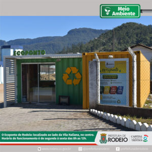 O Ecoponto de Rodeio está localizado ao lado da Vila Italiana, no centro de Rodeio e seu Horário de funcionamento é de segunda à sexta das 8h as 12h.
