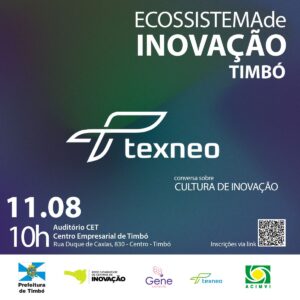 A conversa será com os players de inovação de Timbó e a equipe da TexNeo. A empresa é especializada no desenvolvimento de malhas sports, beach e underwear, sediada em Indaial. Ela abriu um novo canal para potencializar iniciativas atreladas à indústria 4.0. A companhia catarinense criou o programa de Inovação Aberta, que convida empresas de tecnologia, startups e instituições de pesquisa a apresentarem soluções compatíveis com os desafios mapeados.