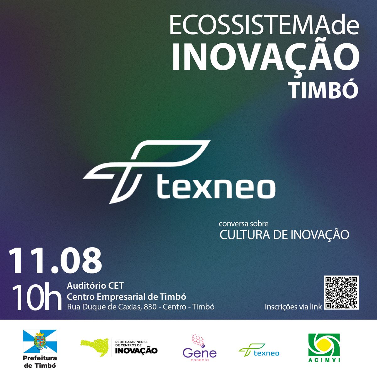 O evento é gratuito, com início às 10h, no Centro Empresarial de Timbó, na Rua Duque de Caxias, 830, Centro. Se inscreva para participar aqui: https://bit.ly/ecossistemadeinovacaotimbo