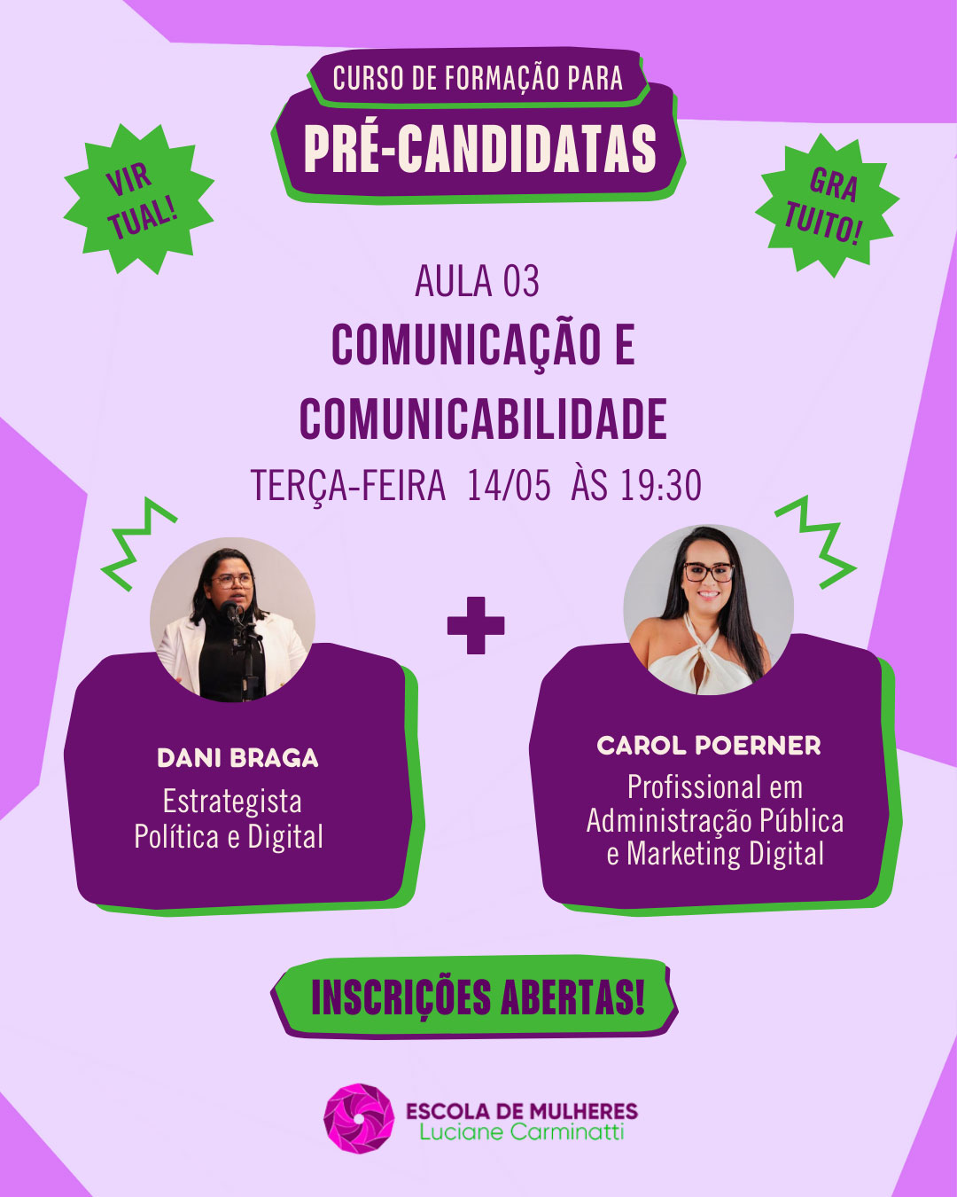 Uma das convidadas é Dani Braga, estrategista política e digital. Tem experiência em campanhas e hoje atua como consultora. Já Carol Poerner é especialista em marketing digital, com atuação em política e assessoria parlamentar. Tem expertise em marketing político, estratégia e conteúdo para as redes sociais.