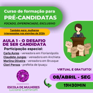 “É uma oportunidade única. Uma importante ação da Escola de Mulheres para garantir formação política gratuita e de qualidade. E, o principal, que isso gerar resultado nas urnas, com a eleição de mais vereadoras e mais prefeitas em Santa Catarina”, defende Luciane.