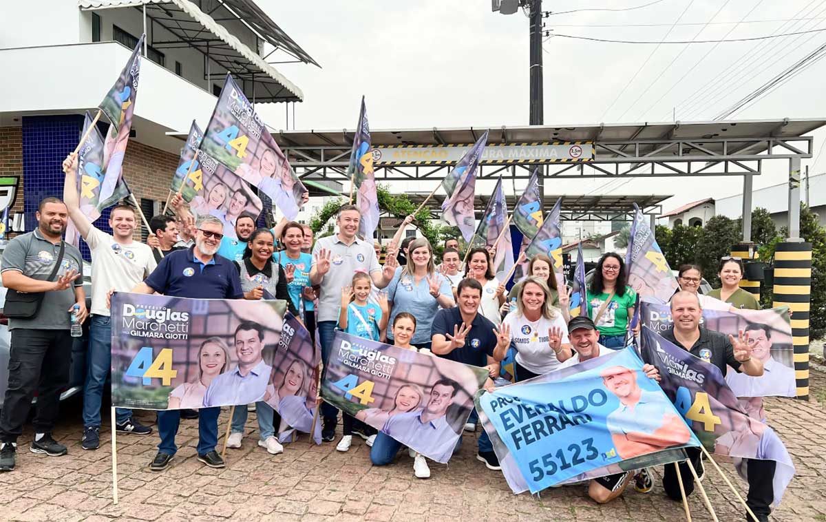 O prefeito de Chapecó, João Rodrigues, e o deputado Estadual Napoleão Bernardes, ambos do PSD, reforçaram o apoio às candidaturas de Douglas Marchetti (União Brasil) para prefeito e Gilmara Giotti (PSD) para vice-prefeita. Rodrigues, que esteve em Timbó no mês de agosto, agora gravou um vídeo e fez um depoimento em favor de Marchetti e Gilmara, destacando que Marchetti é um dos políticos de direita mais convictos de Santa Catarina. Segundo ele, Marchetti não aderiu ao movimento do ex-presidente Bolsonaro por oportunismo, mas sim quando o poder ainda estava nas mãos da esquerda.