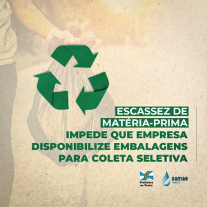O Samae Timbó informa que, devido à falta de matéria-prima, a empresa responsável pela produção das embalagens da coleta seletiva não conseguiu efetuar a entrega das mesmas à autarquia. A empresa disse ainda que essa dificuldade de conseguir a matéria-prima se agravou com a pandemia. Por essa razão, para os próximos dias não serão disponibilizadas novas embalagens nas residências e demais endereços.