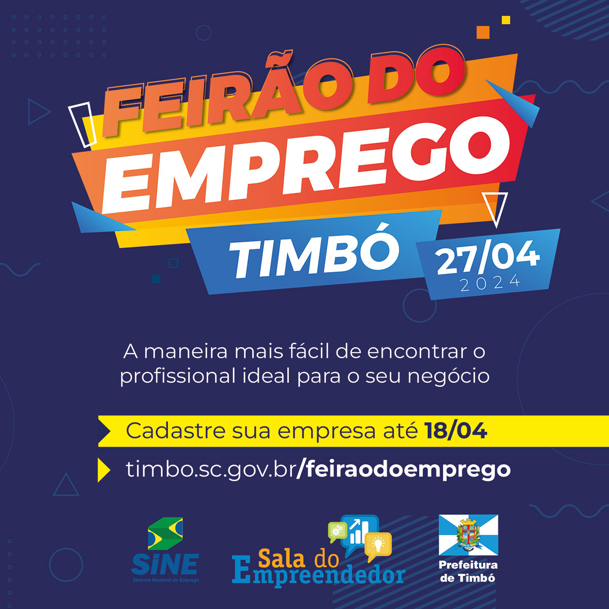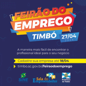 No dia 27 de abril será realizada a segunda edição do Feirão do Emprego de Timbó, promovido pela Prefeitura de Timbó, através da Diretoria de Indústria, Comércio e Serviço, em parceria com o Sistema Nacional de Emprego (Sine Timbó).