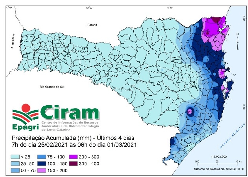 Fevereiro foi marcado por chuva, sobretudo na última semana do mês. O volume de água quase atingiu a marca de 400 milímetros, bem acima do esperado para essa época do ano. A chuva persistente esteve associada a um cavado (área de baixa pressão próximo ao litoral de SP) que se estendeu até o litoral de SC e combinada a um sistema de alta pressão. Esses fatores mantiveram o fluxo de umidade vinda do mar para o litoral catarinense.