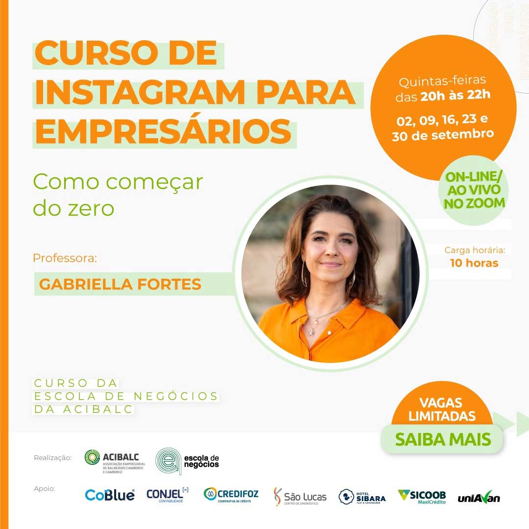 A Escola de Negócios da Associação Empresarial de Balneário Camboriú e Camboriú (Acibalc) traz mais uma novidade para a região: um curso de Instagram para Empresários. A capacitação inicia no dia 2 de setembro e será ministrada ao vivo, em modalidade online, pela professora Gabriella Fortes. Com 10 horas de conteúdo, divididas em 5 módulos, a iniciativa é destinada aos empreendedores que querem aprender a utilizar a ferramenta para gerar negócios.