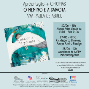 No dia 20 de junho, a escritora estará na FURB, às 19h, para apresentar o livro O Menino e A Gaivota e ministrar a oficina “Tirando Sua História da Gaveta” para graduandos do curso de Artes Visuais da instituição.