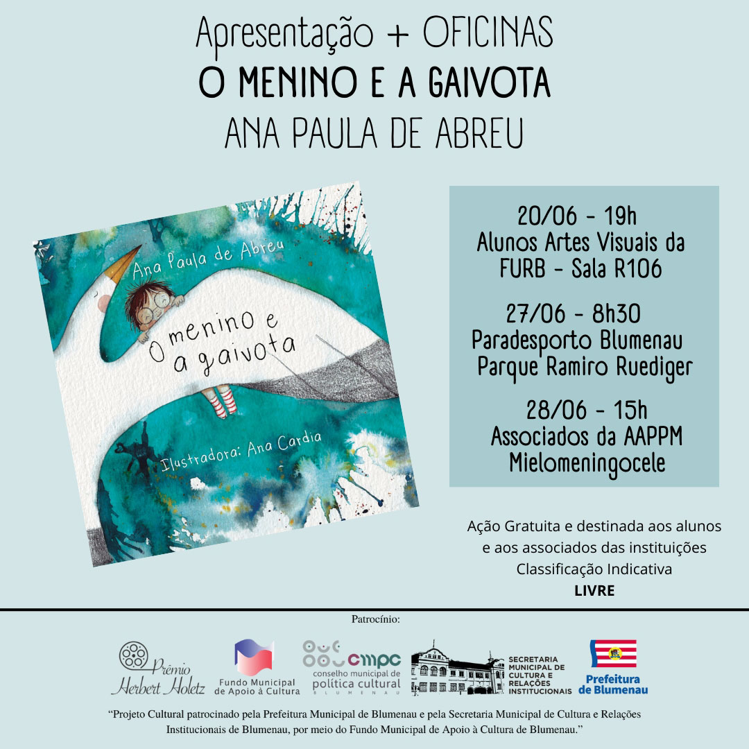 Literatura e liberdade. Neste mês, a escritora de literatura infantil Ana Paula de Abreu faz três oficinas voltadas à arte para alunos e professores de intuições de Blumenau. As ações são gratuitas e fazem parte da contrapartida social do projeto O Menino e a Gaivota, livro recém-lançado pela artista, patrocinado pelo Fundo Municipal de Apoio à Cultura de Blumenau, contemplado no Prêmio Herbert Holetz.