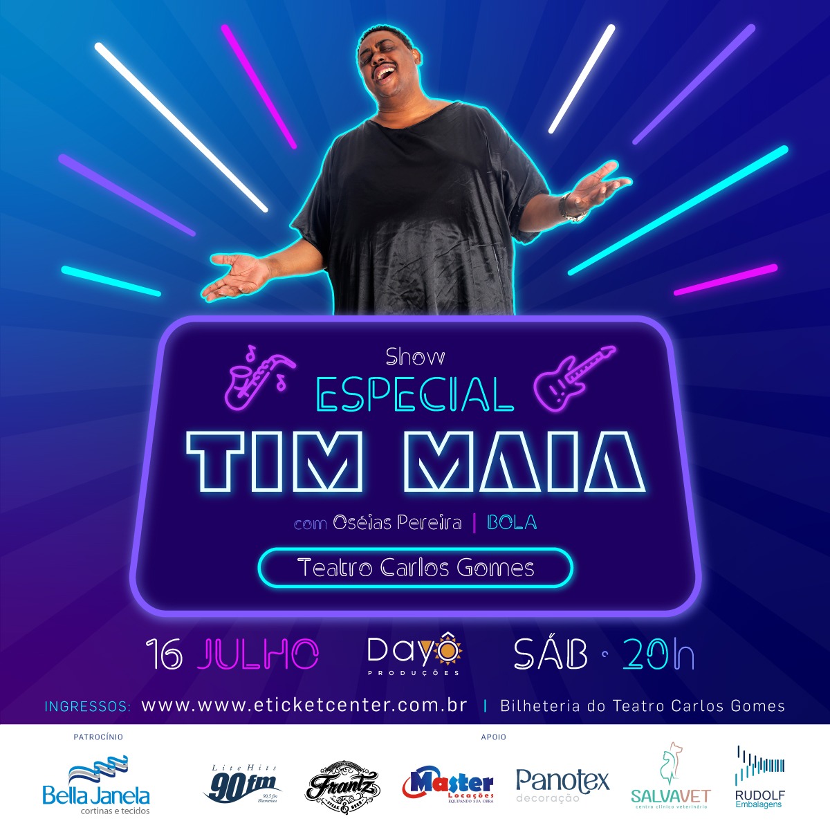Música brasileira. Neste sábado, dia 16 de julho, a Dayô Produções traz a Blumenau o show Especial Tim Maia, interpretado pelo artista Oséias Pereira. O evento ocorre às 20h, no Auditório Heinz Geyer, no Teatro Carlos Gomes, e os ingressos já estão à venda pelo www.eticketcenter.com.br/eventos/show/especial-tim-maia-blu/16-07/20-00 – No palco, o intérprete estará acompanhado por uma banda seleta: Jimmy Allan, na bateria; Beiss Costa, no baixo; Rogério Galera, no teclado e piano; Mazin Silva, na guitarra; Bruno Soares no trompete; Carlos Henrique, no trombone; Suelen Mondini, no saxofone; e Bel Cidral e Oziel nos backing vocals.