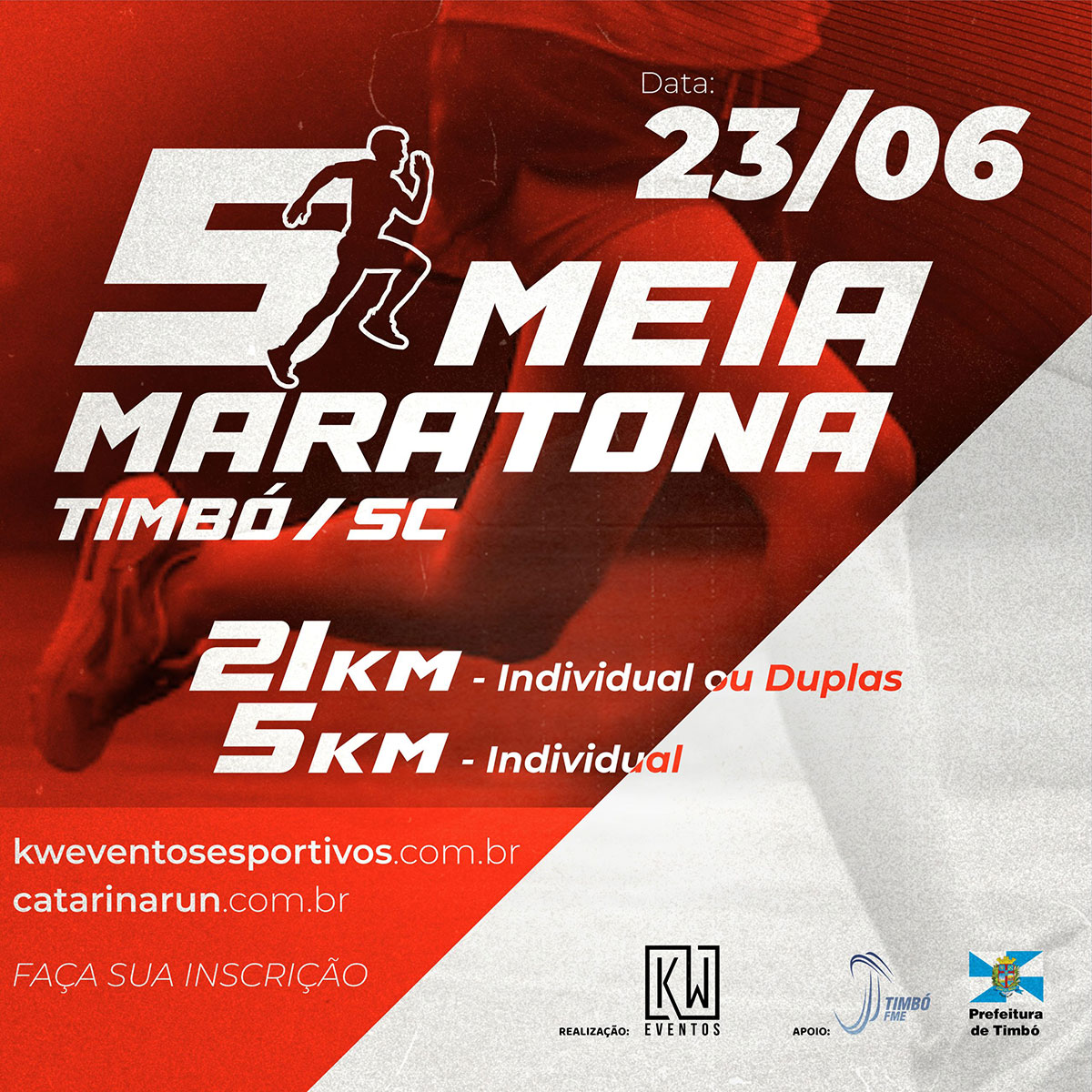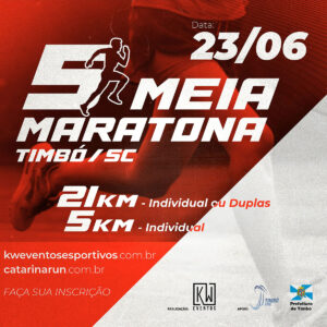 A 5ª Meia Maratona de Timbó é uma realização da KW Eventos, com apoio da Prefeitura de Timbó, através da Fundação Municipal de Esportes (FME).