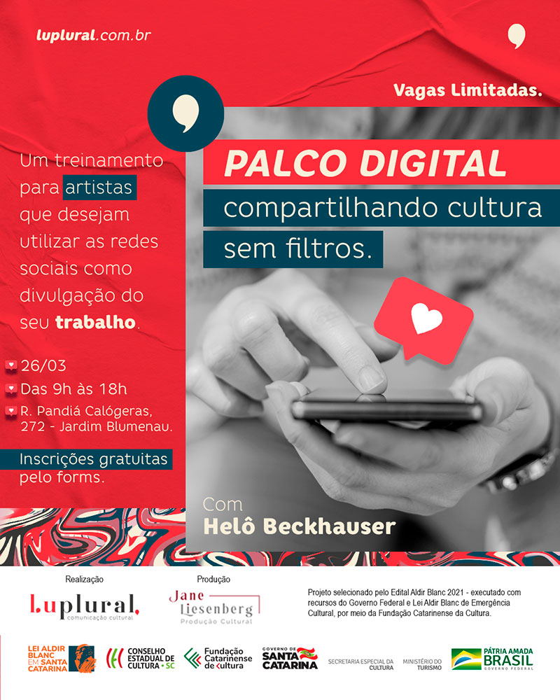 O projeto Palco Digital, Compartilhando Cultura Sem Filtros; da proponente Heloisa Fernanda Beckhauser, é patrocinado pelo Edital Aldir Blanc 2021 – executado com recursos do Governo Federal e Lei Aldir Blanc de Emergência Cultural, por meio da Fundação Catarinense de Cultura. Acompanhe as novidades pelo instagram.com/luplural